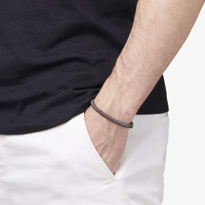 Bracciale in titanio, catena e t-bar in argento 925 e anello brisè in oro giallo 18K.
