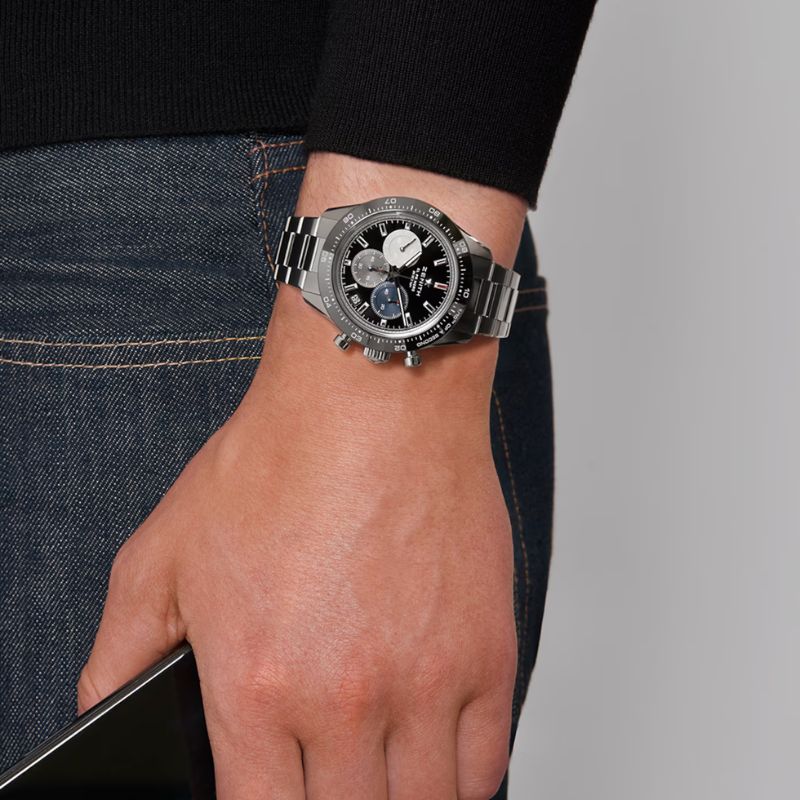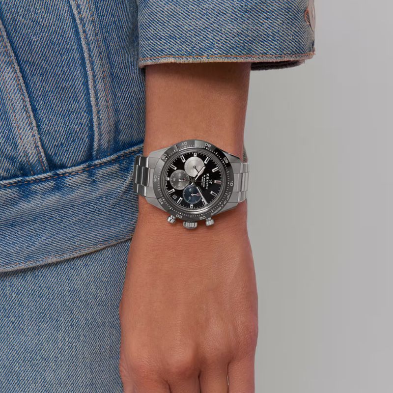 Il CHRONOMASTER Sport con moderna cassa da 41 mm combina elementi dei cronografi passati ZENITH come il quadrante tricolore, i pulsanti a pompa e il bracciale in acciaio a una lunetta in ceramica nera. Animato dal movimento cronografico automatico El Primero 3600 con precisione al 1/10 di secondo, questo modello è dotato di quadrante nero e bracciale integrato.