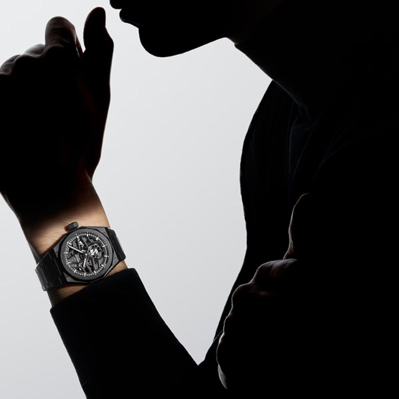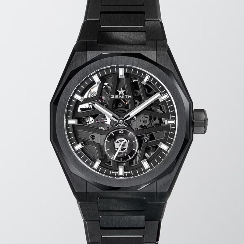 L’orologio DEFY Skyline Skeleton con cassa ottagonale in ceramica nera da 41 mm e lunetta sfaccettata si distingue per il quadrante aperto nero, ispirato all’emblematica stella a quattro punte di ZENITH. Animato dal movimento di manifattura automatico scheletrato ad alta frequenza El Primero 3620 SK, dotato del primissimo indicatore con precisione al 1/10 di secondo. Viene fornito con un bracciale in ceramica e un secondo cinturino in caucciù nero con motivo per sperimentare appieno l’intercambiabilità.