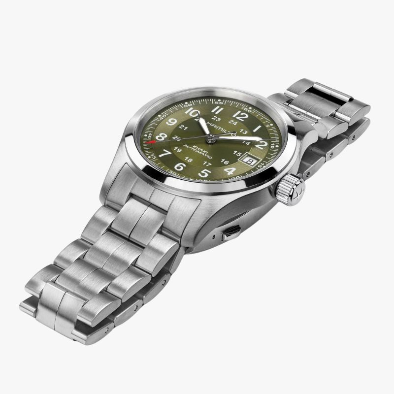 Il Khaki Field Automatic unisce tradizione militare e design contemporaneo in un modello versatile. Combinando un quadrante verde kaki finitura soleil con un effetto a spirale sull’anello delle ore, il quadrante riflette la luce aggiungendo texture e profondità. Progettato per l’azione e l’avventura, l’esclusivo calibro automatico H-10 offre fino a 80 ore di riserva di carica.