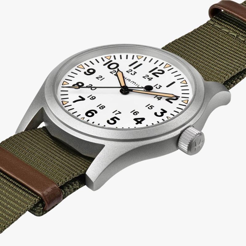 Animato dall’esclusivo movimento a carica manuale H-50, il Khaki Field Mechanical 42 mm conserva la forma originale con una cassa in acciaio con finitura sabbiata e quadrante facilmente leggibile in bianco o nero. Abbinata ad un cinturino NATO in tessuto verde, questa versione rivisitata di un orologio militare dal design robusto e resistente non ti farà perdere nessuna avventura.