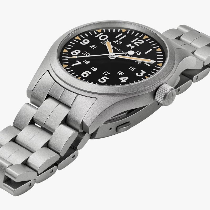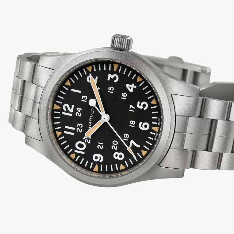 Animato dall’esclusivo movimento a carica manuale H-50, il Khaki Field Mechanical 42 mm conserva la forma originale con una cassa in acciaio con finitura sabbiata e quadrante facilmente leggibile in bianco o nero. Abbinata ad un comodo bracciale in acciaio, questa versione rivisitata di un orologio militare dal design robusto e resistente non ti farà perdere nessuna avventura.
