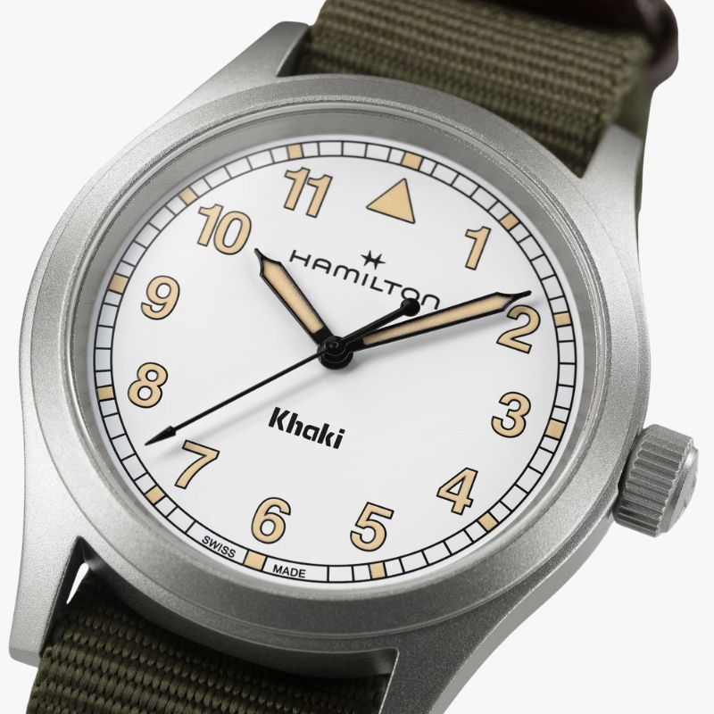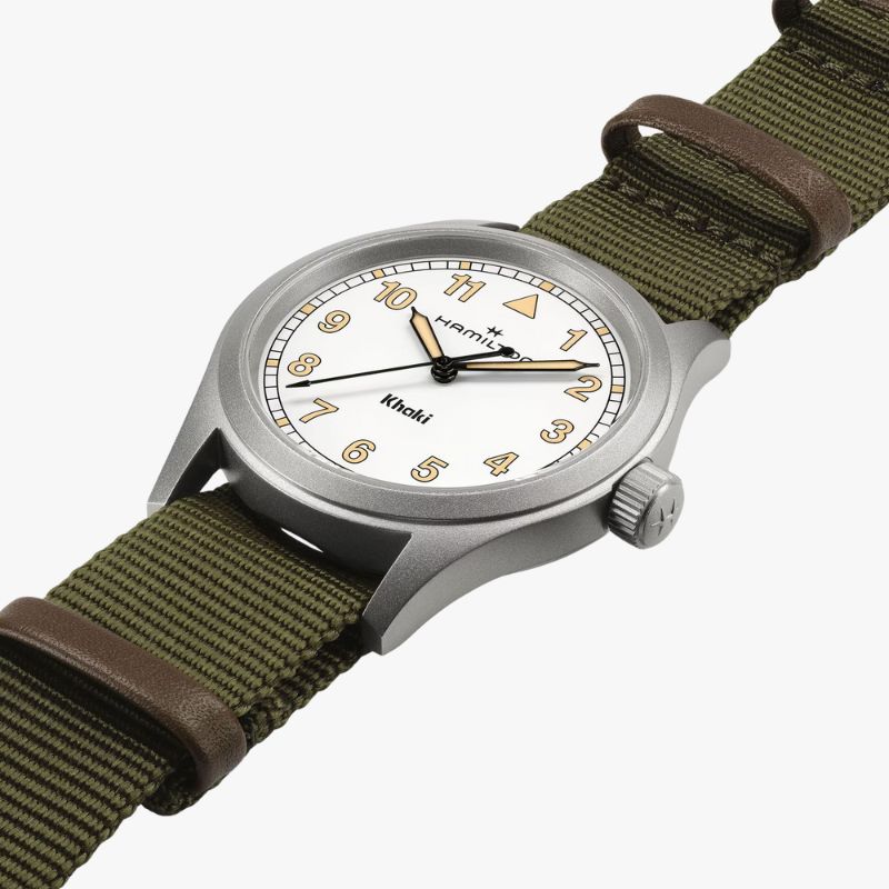 Sul quadrante del Khaki Field Quartz spicca un font chiaro con numeri arabi ben dritti e una minuteria a binario. La palette cromatica è sobria: un quadrante bianco raffinato messo in risalto da indici in Super-LumiNova® color rodio anticato. L’orologio è provvisto di un cinturino verde in tessuto NATO con passanti in pelle marrone.