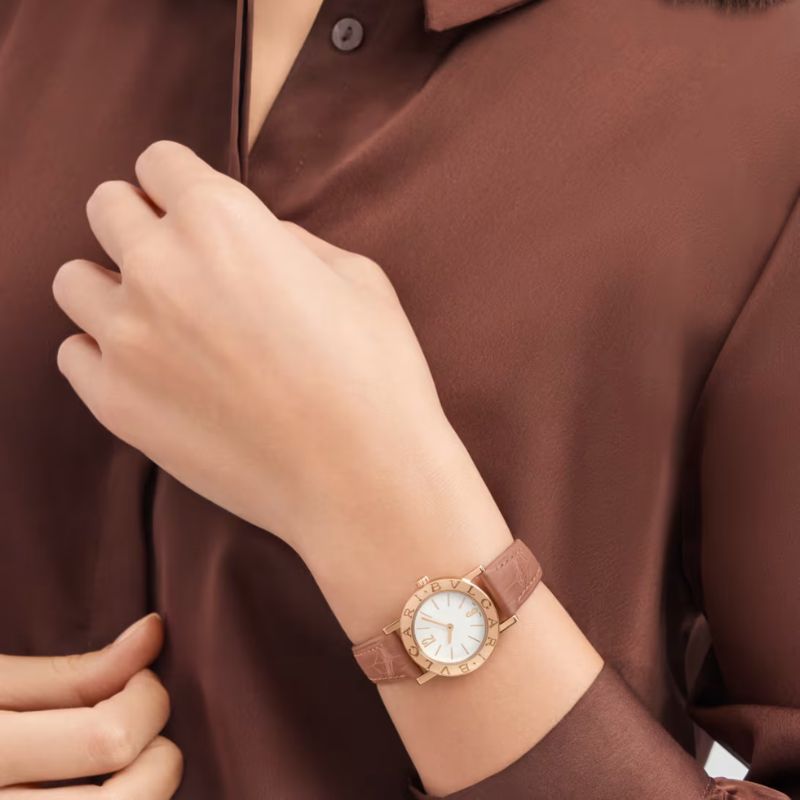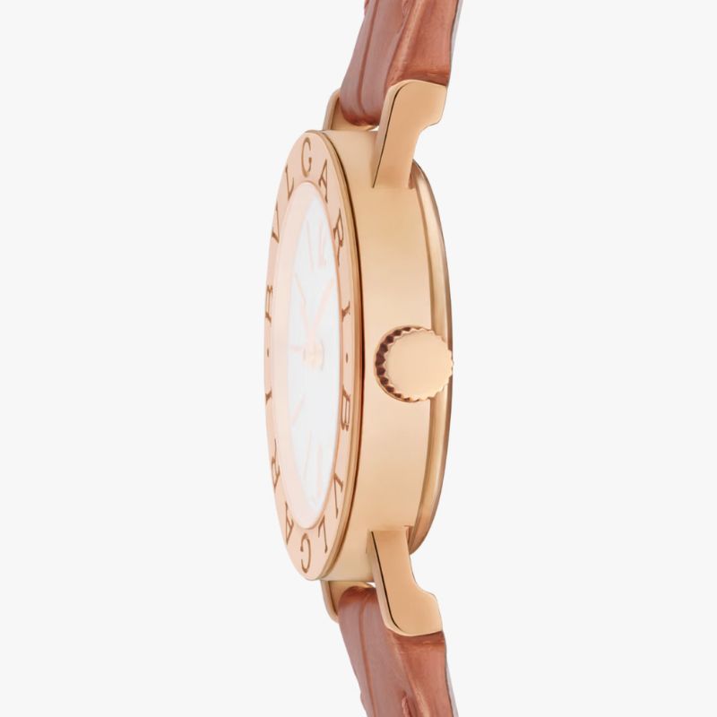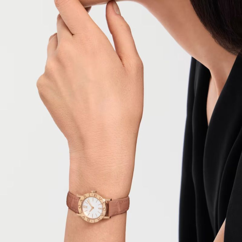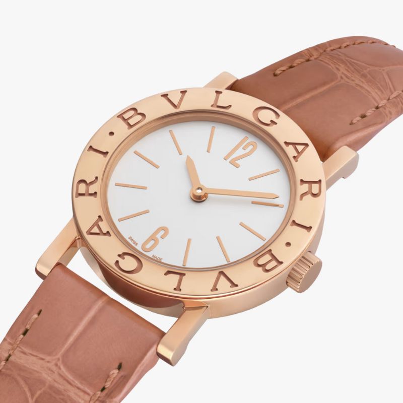 Orologio Bvlgari Bvlgari al quarzo con cassa 26mm in oro rosa 18 kt e lunetta con doppio logo, quadrante opalino bianco e cinturino in alligatore beige. Impermeabile fino a 30 metri.