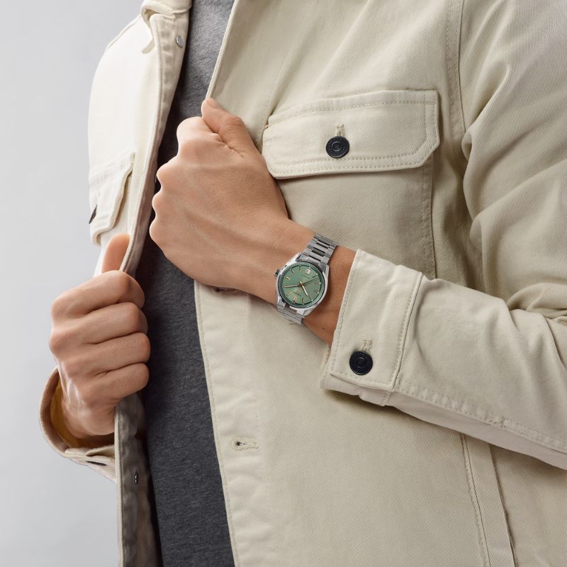 Le sobrie tonalità verde pastello del quadrante spazzolato effetto soleil conferiscono un tocco unico di eleganza a questo modello TAG Heuer Carrera. Grazie al bracciale ergonomico in acciaio e al potente movimento Calibre 7, questo segnatempo classico è l’alleato ideale in città.